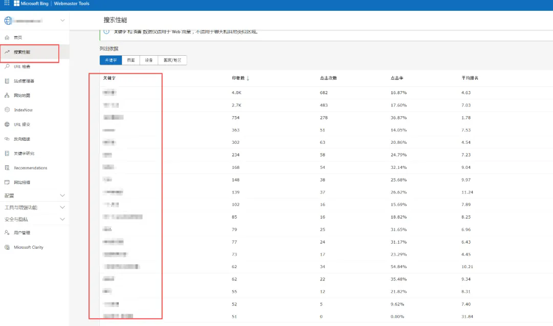 选搜索性能,在“关键字”栏就可以看到很多从搜索引擎过来的关键字。